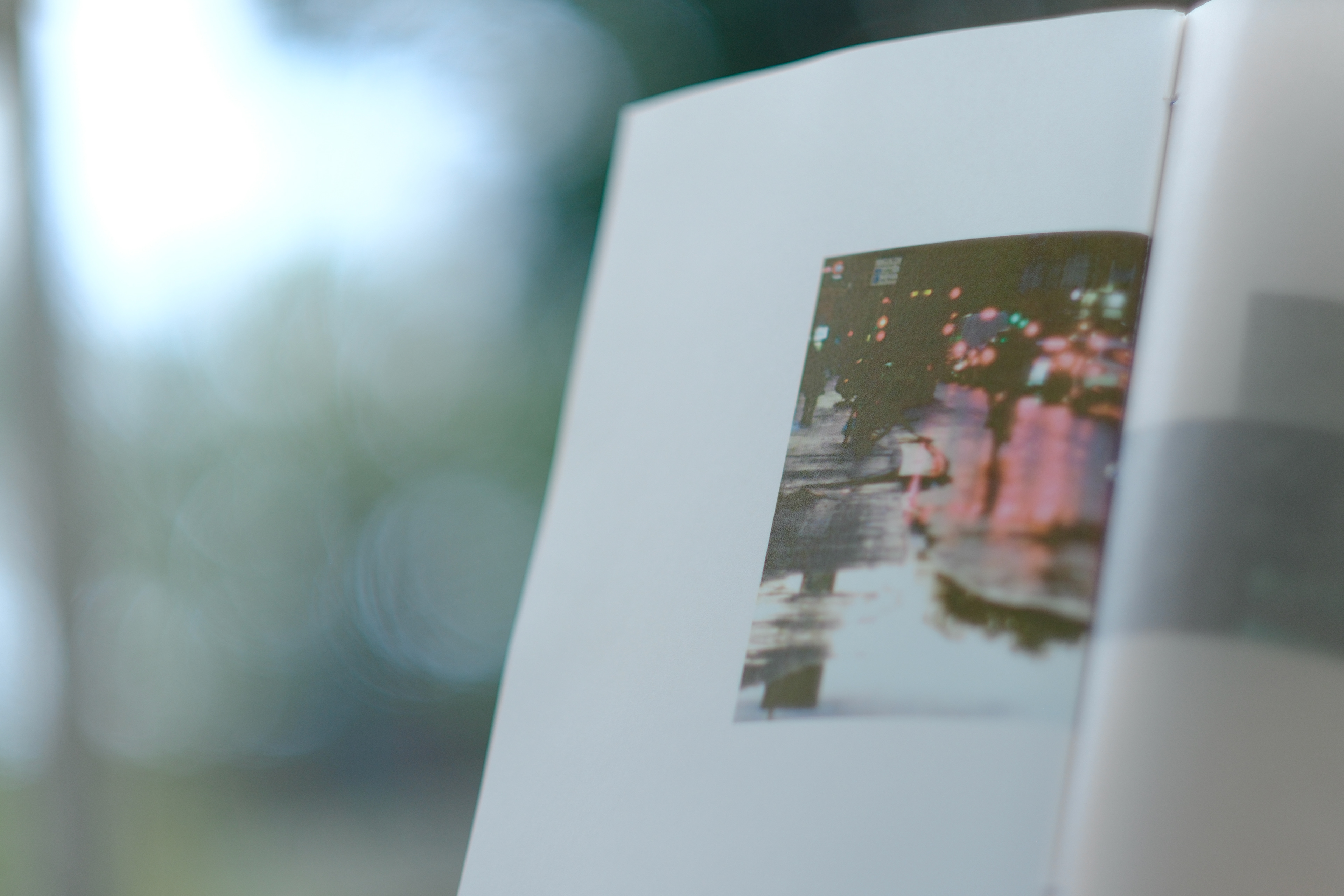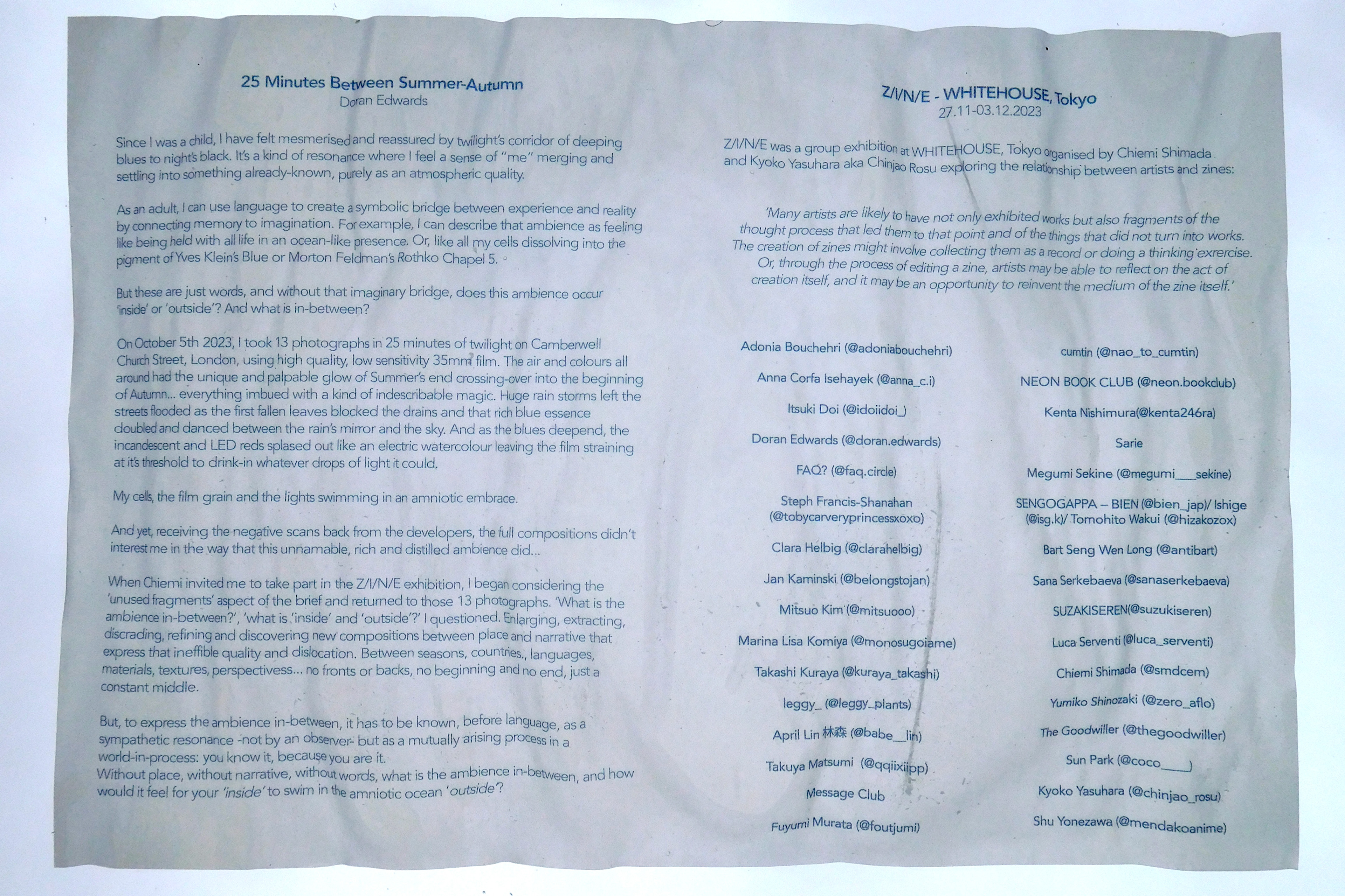 Z/I/N/E was a group exhibition at WHITEHOUSE, Tokyo organised by Chiemi Shimada and Kyoko Yasuhara aka Chinjao Rosu exploring the relationship between artists and zines. To explore the 'unused fragments' aspect of the brief, I searched for the 'ambience in-between' in 13 photos taken in 25 minutes of twilight that distinctly marked the change of season on low sensitivity 35mm colour film. Knowing and being mesmerised by this quality of light since childhood, I felt held in an ambience in-between all things, in an amniotic, oceanic embrace, as the passed storm left the streets flooded with a mirror for the sky and the car lights splashed out like an electric water colour. Thank you to Matt Martin at Photobook Cafe for printing, binding and helping me put the zine together.